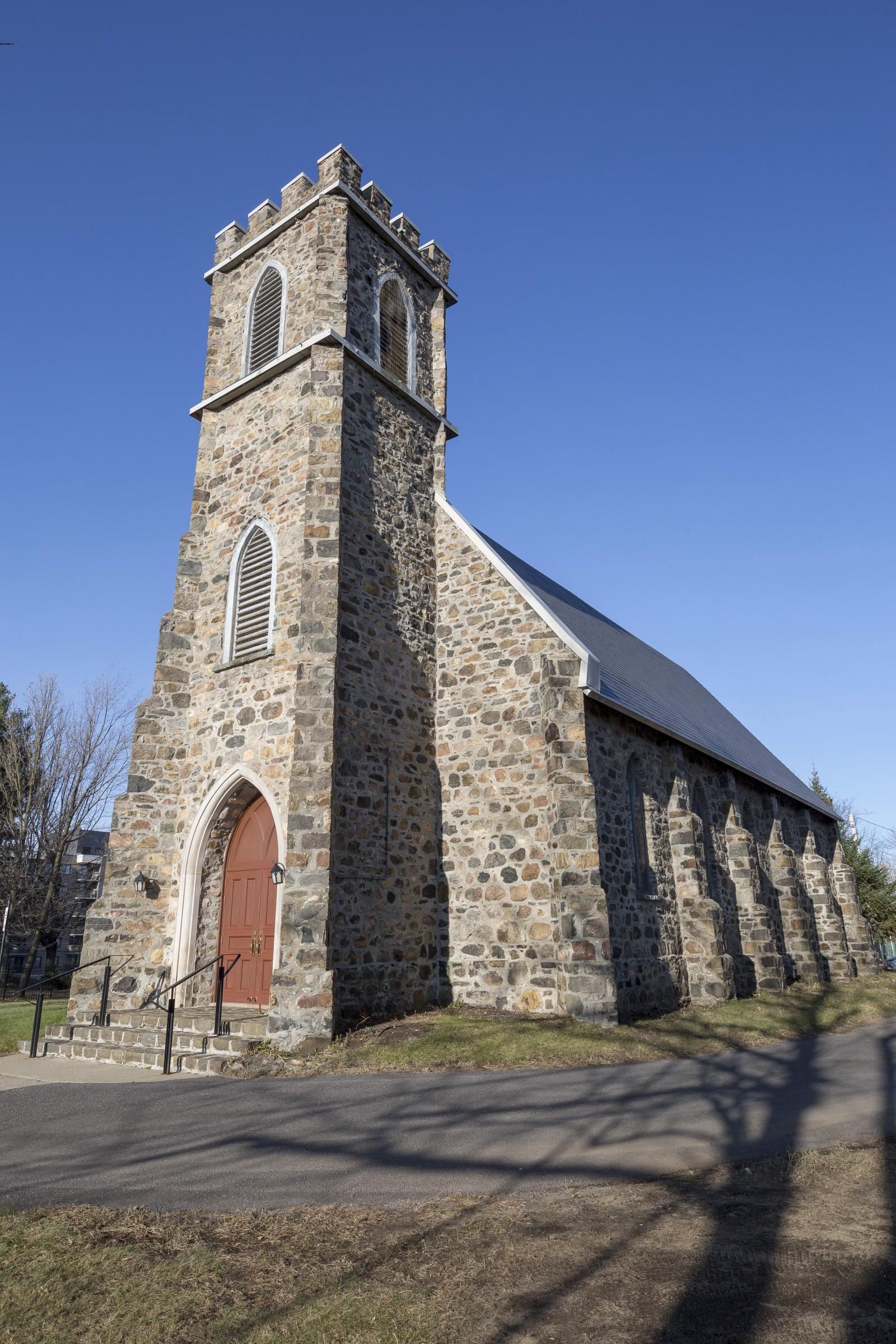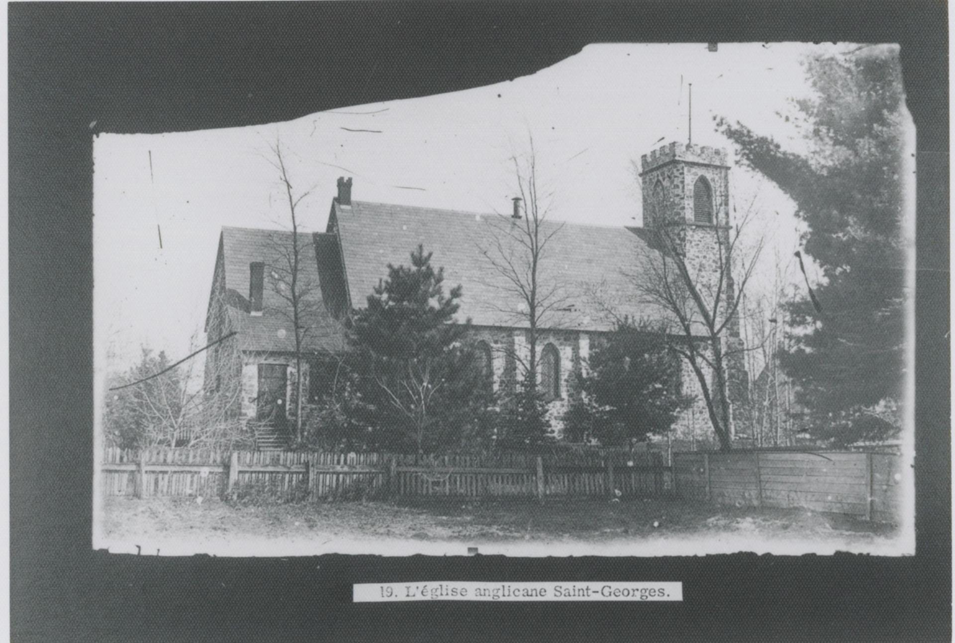 En 1819, la communauté anglicane de Drummondville occupe un bâtiment servant d’école, de cour de justice et de lieu de culte. L’église actuelle est construite en remplacement de la première, un édifice en bois construit en 1820 à l’emplacement du cimetière qui jouxte l’église actuelle. La paroisse de St. George est fondée le 14 mai 1822. Robert Nugent Watts (avant 1821-1867), cousin de Heriot, cède une portion de terrain pour la construction de la nouvelle église et s’engage dans le projet. Érigée en 1855 et 1856, l’église St. George est un bon exemple de l’un des modèles de lieu de culte conçus par l’Église anglicane au 19e siècle. Un incendie détruit partiellement l’église St. George le 3 mai 1863. Elle est reconstruite à partir des murs en pierre restants. Entre 1887 et 1896, le toit est couvert d’ardoise, les murs intérieurs sont lambrissés de sapin de Colombie et le chœur s’orne d’un autel en chêne. En 1908, une tempête fait tomber la flèche du clocher qu’on remplace par une couronne crénelée. En 1950, une sacristie en appentis est accolée au chœur. Au début des années 1980, on remplace l’ardoise de la couverture par du bardeau d’asphalte. En 1993, on refait le parvis de l’église en pierre, comme à l’origine. Entre 1998 et 2001, le bâtiment est complètement restauré en respectant les matériaux d’origine, dont le parement de toiture en ardoise.